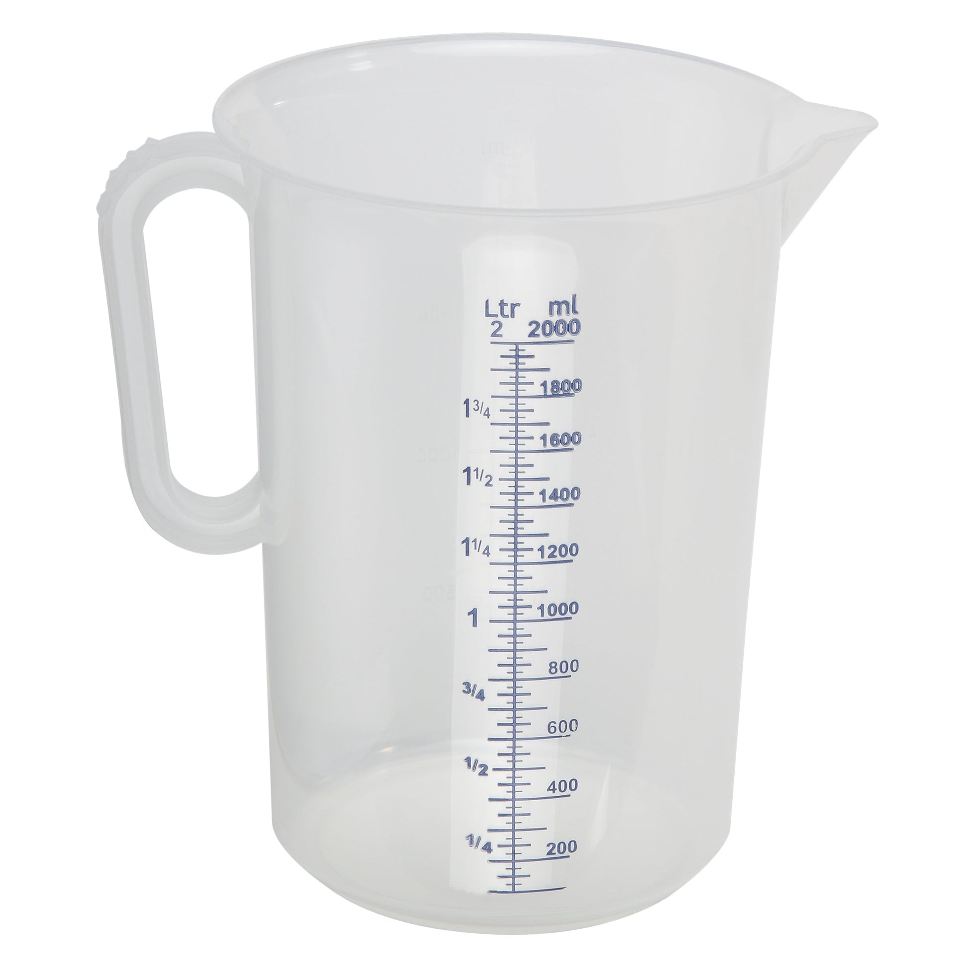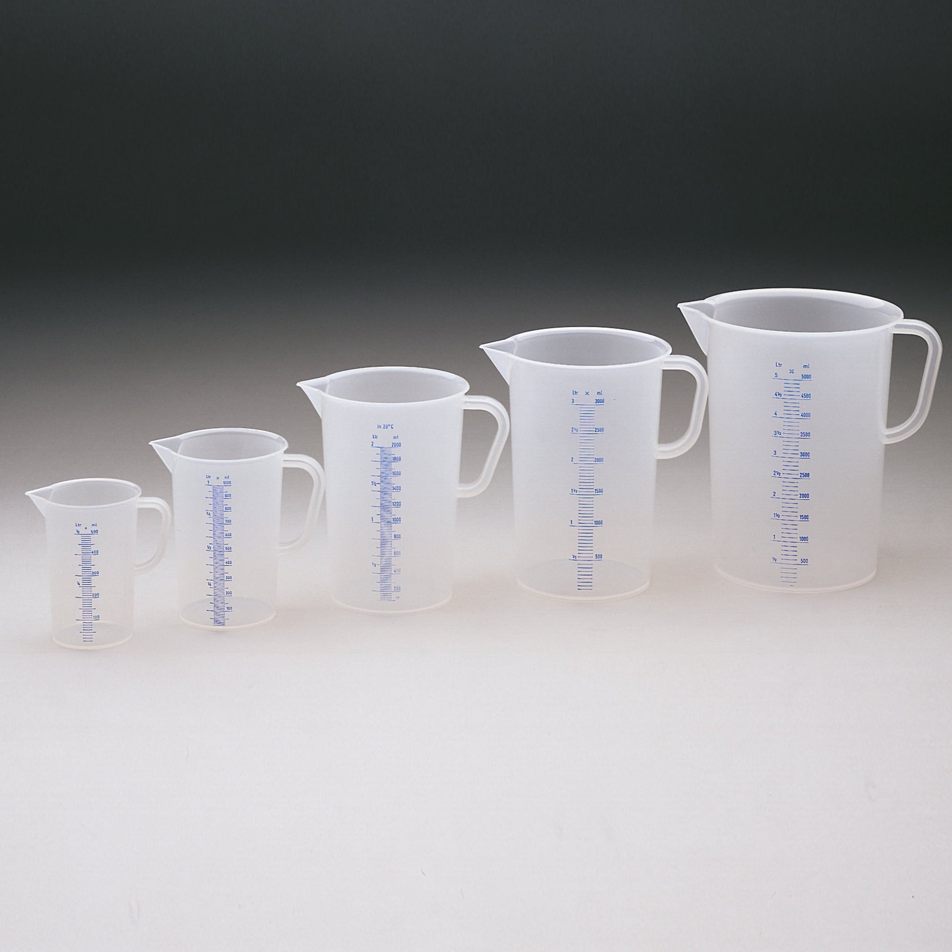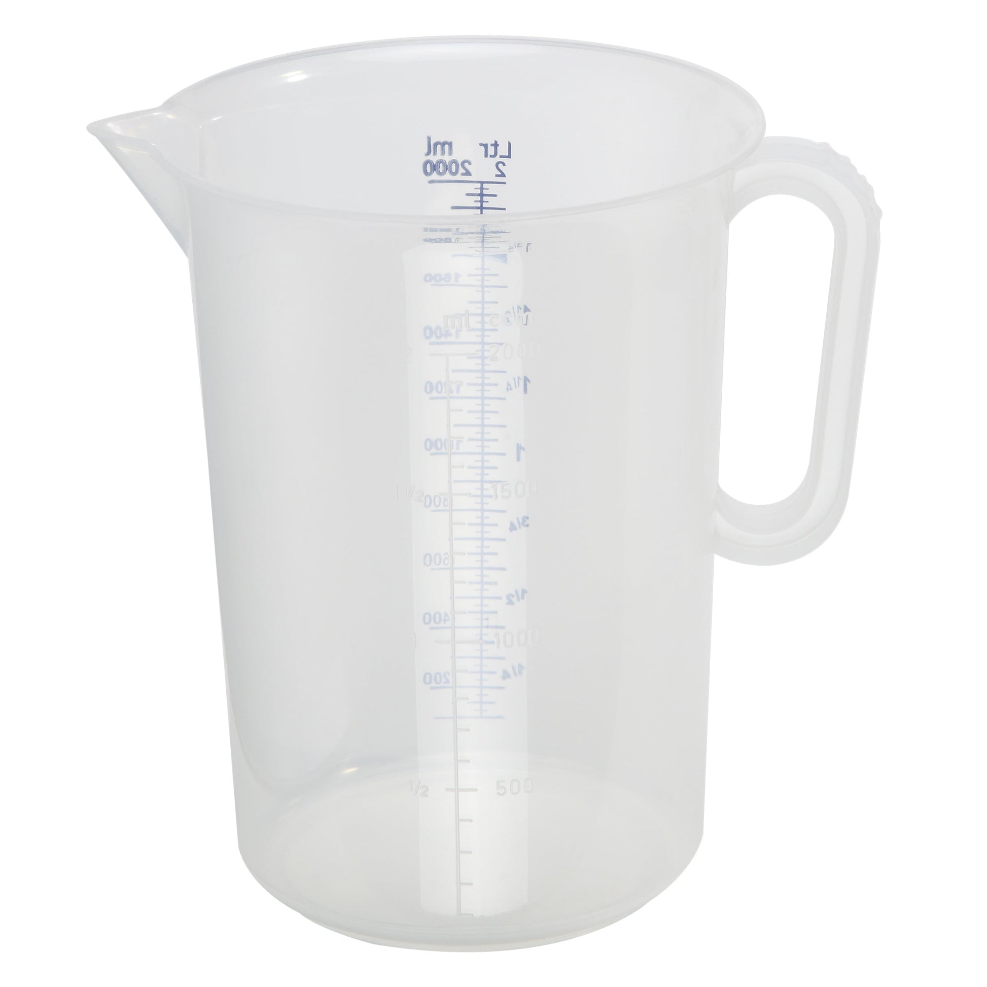 Messbecher aus Kunststoff mit gedruckter Literskala in blau. Volumen 0,25-5 Liter, Geschlossener Griff. Spülmaschinengeeignet.