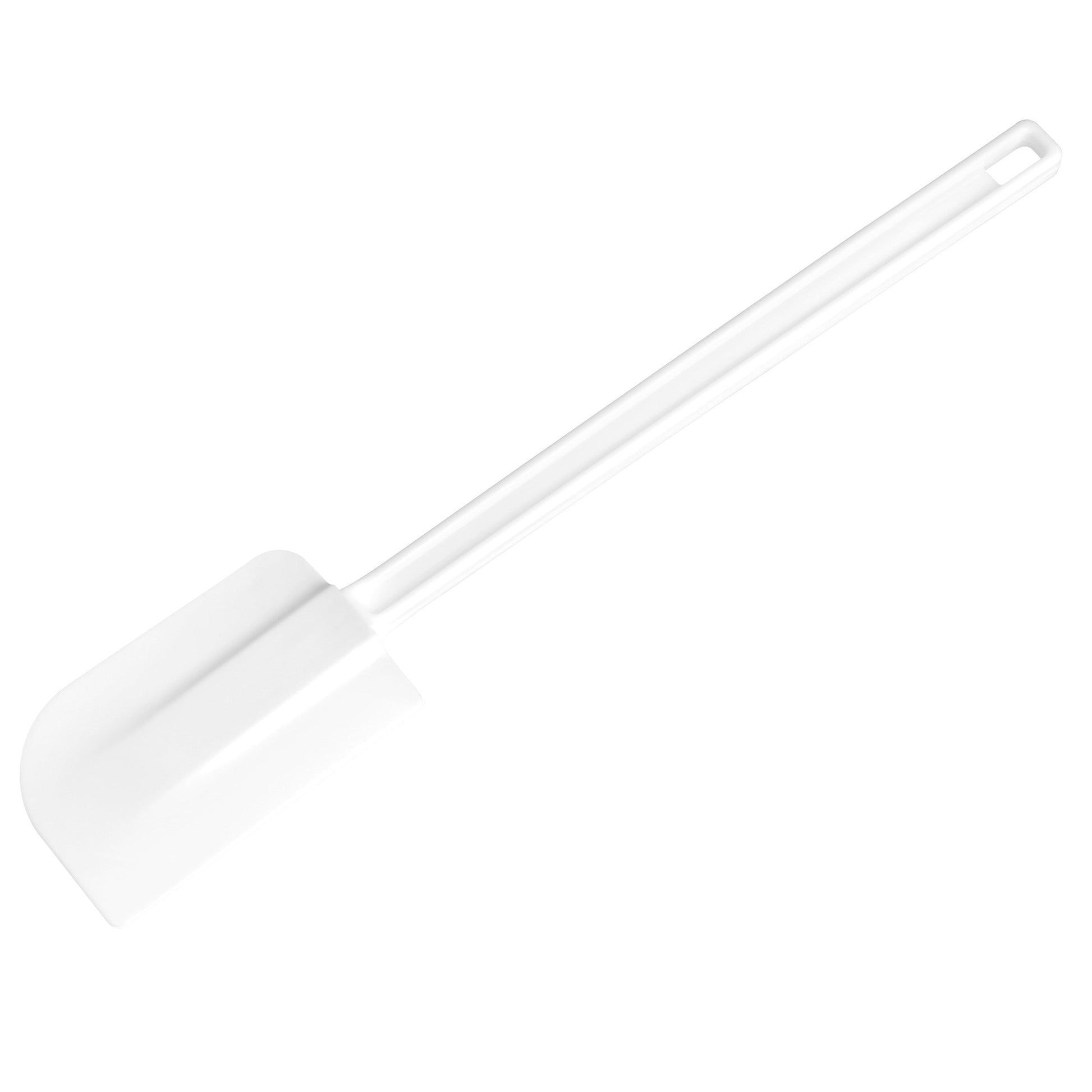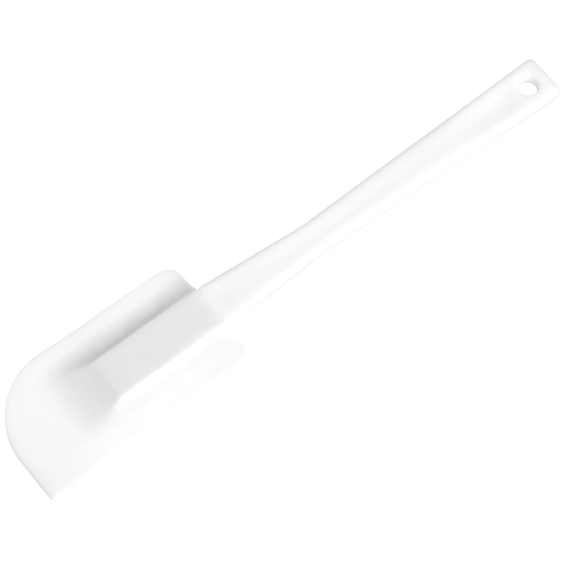 Stielschaber aus Gummi mit Stiel aus weißem Kunststoff. Einzeln in Folie verschweißt. Spülmaschinengeeignet.