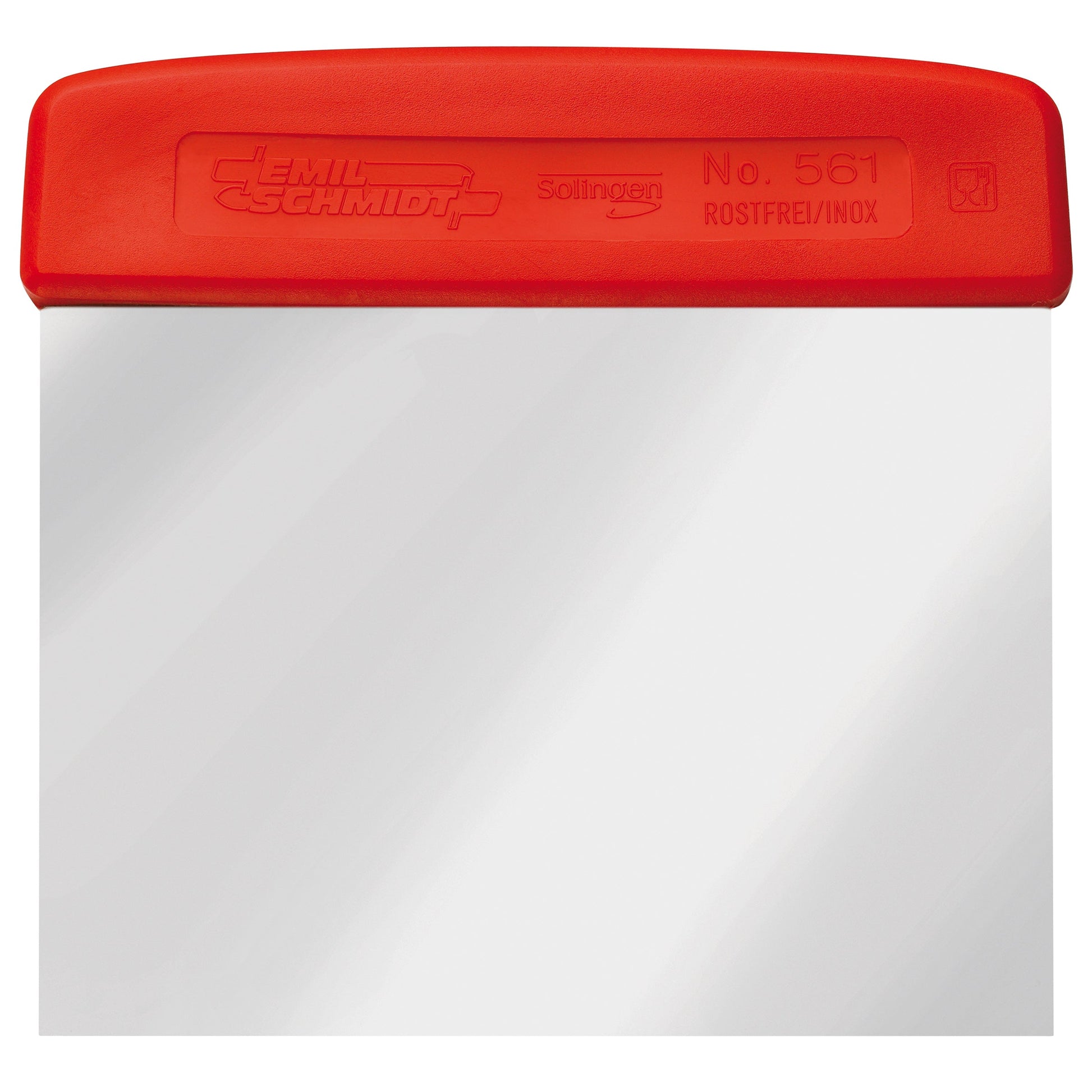 Teigabstecher mit rostfreier Metallklinge und Kunststoffgriff in rot, eckige Klinge. „Emil Schmidt“-Logo als erhaben eingespritztes Relief in der Griffleiste. Klinge und Griff fest / unflexibel. Spülmaschinengeeignet.