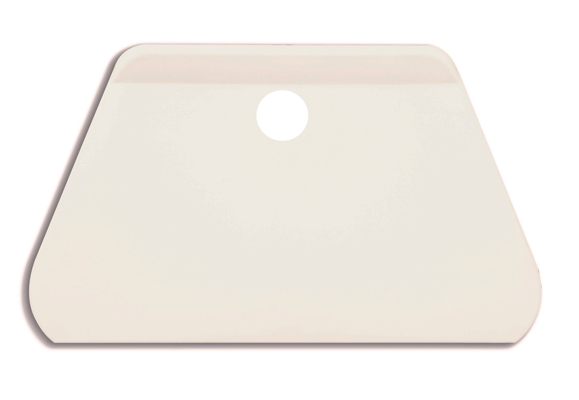 Teigschaber aus Polypropylen in Trapezform mit Griffleiste und abgerundeten Ecken, mit und ohne Daumenloch. Mit Glas- und Gabel Zeichen und Herstellerkennung als eingespritztes Relief auf der Rückseite. Spülmaschinengeeignet.