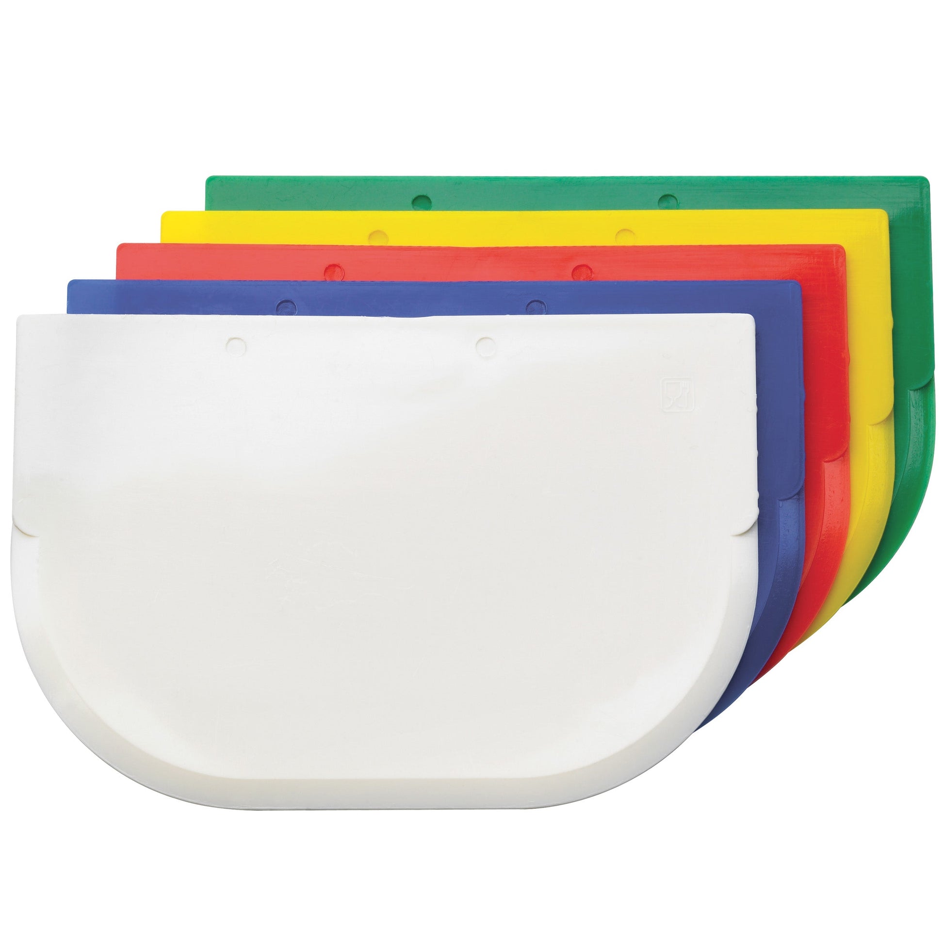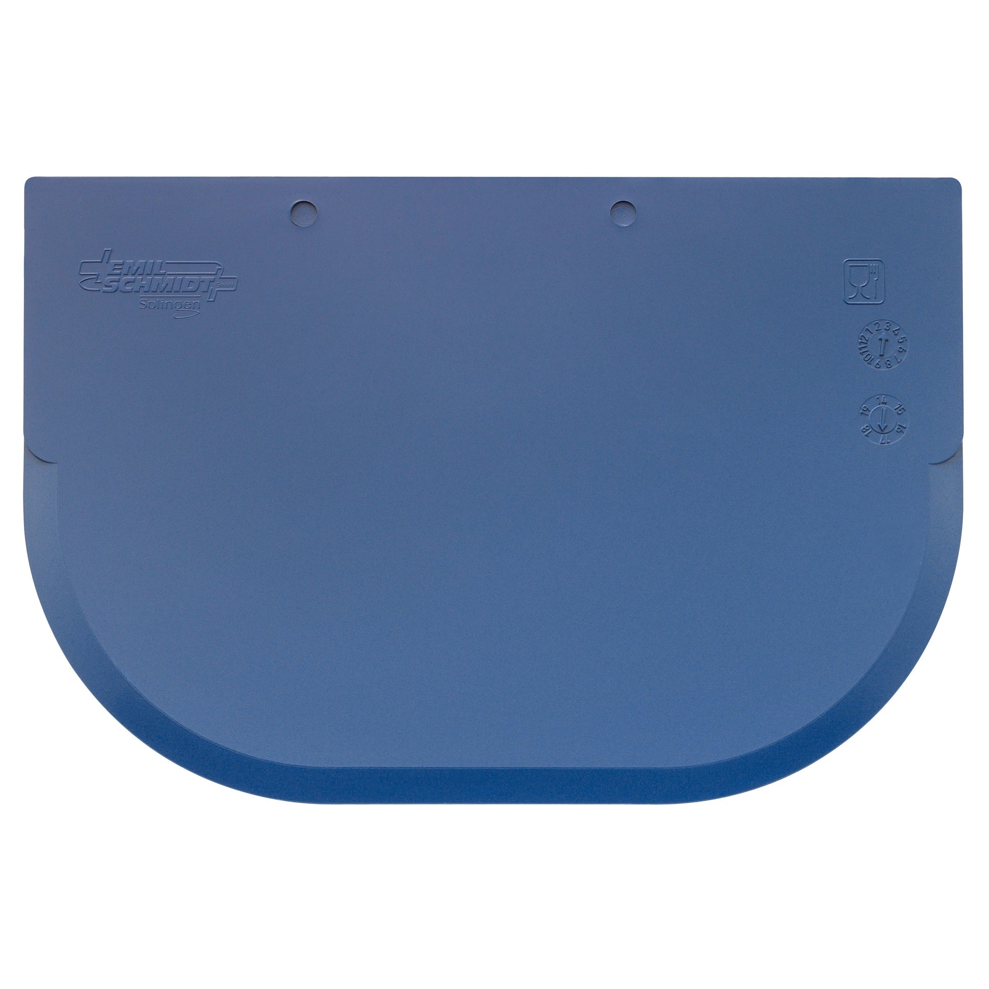Teigschaber aus Polypropylen in symmetrischer Form. Mit Glas- und Gabel Zeichen und Herstellerkennung als eingespritztes Relief auf der Rückseite. Spülmaschinengeeignet.