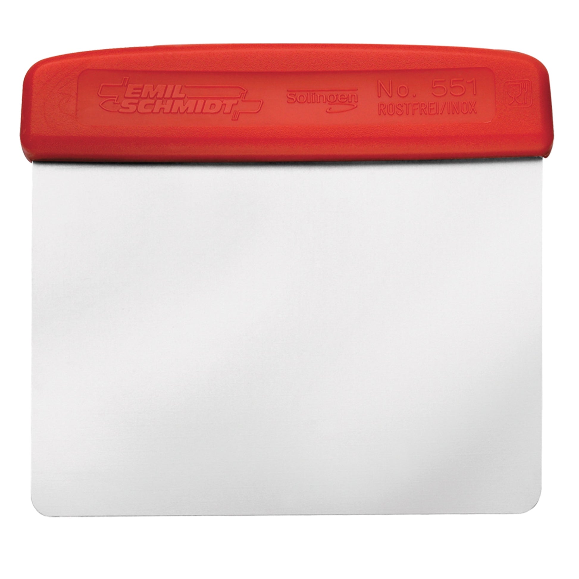 Teigabstecher mit rostfreier Metallklinge und Kunststoffgriff in rot, blau, gelb und weiß. „Emil Schmidt“-Logo als erhaben eingespritztes Relief in der Griffleiste. Klinge und Griff fest / unflexibel.